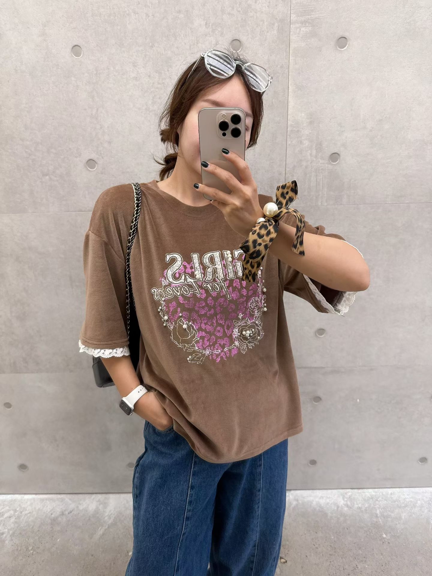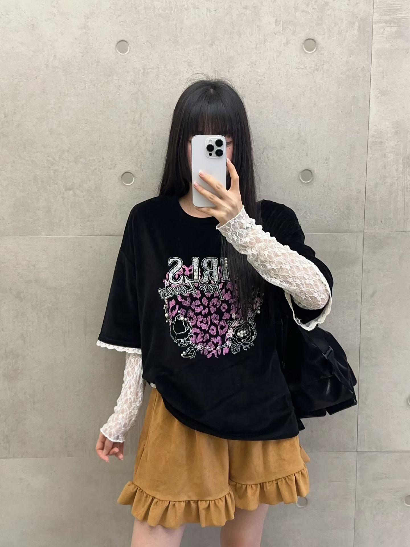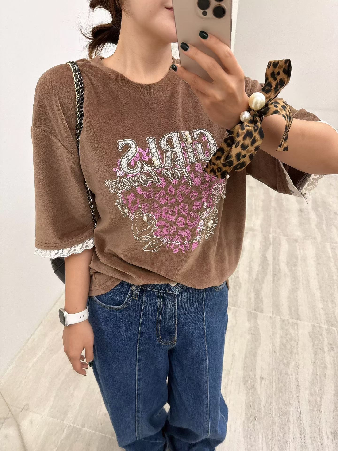 🇰🇷K5527 絲絨印豹紋心心花邊袖tee (預訂款3-4星期)